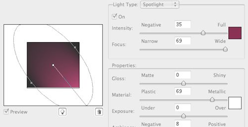 首先創建一個漂亮的背景。新建一個ps文檔,背景填充為黑色(D→Alt+Delete)。創建一個新圖層(Ctrl+Alt+Shift+N)并填充為白色(D→Ctrl+Delete)。下面將用“光照效果”濾鏡(濾鏡》渲染》光照效果)在這層上制作柔美的漸變效果。在強度調節旁邊,選擇你喜歡的任意顏色只要有一些深的顏色就可以。比如,我選擇了深粉色/紫色。
